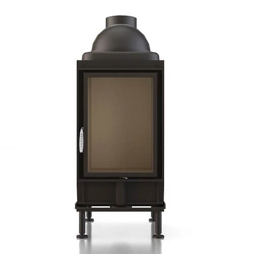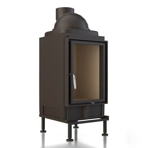 – Kachelofeneinsatz im Hochformat mit Kaminoptik in flacher Scheibenausführung