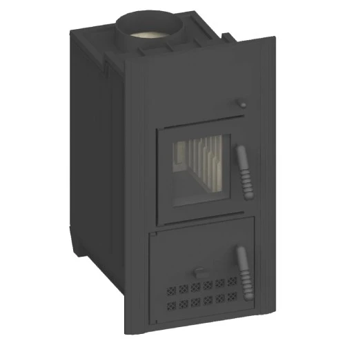 – Mit massiven Schamottesteinen ausgestatteter Kachelofeneinsatz. Diese werden trocken ohne Einmauerung in das Gerät gestellt.