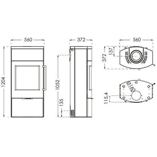 Der Kaminofen TermaTech TT80 hat eine Höhe von 1052 mm bis zur Anschlussstelle des Rauchrohrs an der Rückseite und 1204 mm bis zur Anschlussstelle oben. Die Höhe bis zur Verbrennungsluftanschlussstelle (Mitte) beträgt 135 mm. Diese Maße ermöglichen eine unkomplizierte Installation in Ihrem Zuhause.
