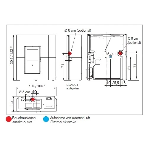 Der Pelletofen Blade2 H 22 Up von Edilkamin ist mit seiner schlanken Bauweise von nur 39cm Tiefe ein echtes Raumwunder. Die zwei wählbaren Keramikverkleidungen in Rot und Grau lassen keine Wünsche offen. Mit Hilfe eines zweiten Ventilators zur Erzeugung von Warmluft, kann der Edilkamin Blade2 H 22 Up die erzeugte Wärme durch einen Kanalisierungsanschluss an der Rückseite des Gerätes in einen angrenzenden Raum verteilen. Das Kit für die Wärmeverteilung können Sie im individuellen Zubehör bestellen.