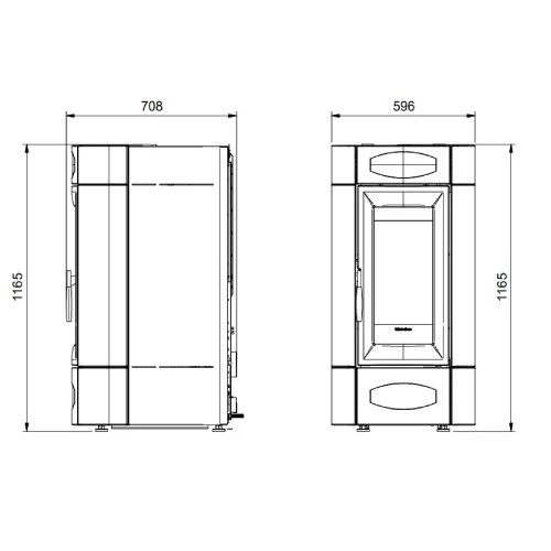 – Raumluftunabhängiger, wasserführender Pelletofen aus hochwertigen Materialien und mit hermetischem Tank. Hier bestehen Tür und Brennschale aus Gusseisen, während die Verkleidung eine Kombination aus Majolika und lackiertem Blech ist.