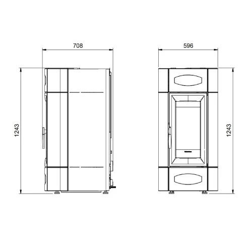 – Raumluftunabhängiger, wasserführender Pelletofen aus hochwertigen Materialien und mit hermetischem Tank. Hier bestehen Tür und Brennschale aus Gusseisen, während die Verkleidung eine Kombination aus Majolika und lackiertem Blech ist.