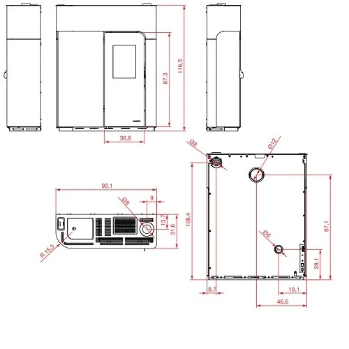Der PALAZZETTI Pelletofen Ecofire Elisabeth 9kW ist bereits serienmäßg mit einer Rücklaufanhebung ausgestattet. In das Gerät wurde bereits die Hydraulikgruppe bestehend aus Umwälzpumpe, Sicherheitsventil, geschlossenem Ausdehnungsgefäß und Druckmesser integriert. Die innovative Feuerstätte ist umschlossen von einer halbrunden Feuerstätte, um den Wärmeaustausch mit dem Wasser deutlich zu erhöhen. Die heißen Rauchgase werden durch 8 oder 12 Rohre umgeleitet, die in das Wassear des Heizkessels eingetaucht sind. Diese Rohre sind mit Turbolatoren ausgerüstet, die so die Rauchgase spiralenförmig ableiten und so zusätzlich den Wärmeaustausch erhöhen.